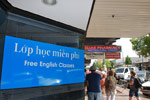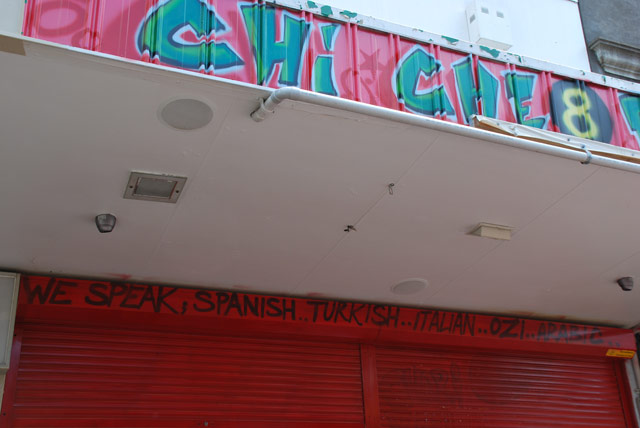 With many new migrants, including refugees settling in the Fairfield area 20% of the population in 2011 reported as not being able to speak English well or at all (as compared with 5.8% in the rest of Sydney). This sign advertising free English classes reflects the institutionalisation of a range of services provided to migrants in the area. The adjacent pharmacy sign reflects the appropriation of the ‘multicultural’ brand by local businesses in a local government area which has adopted the City motto of ‘celebrating diversity’.