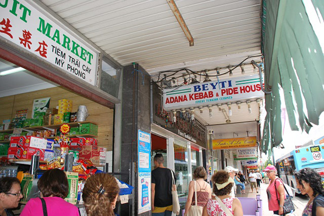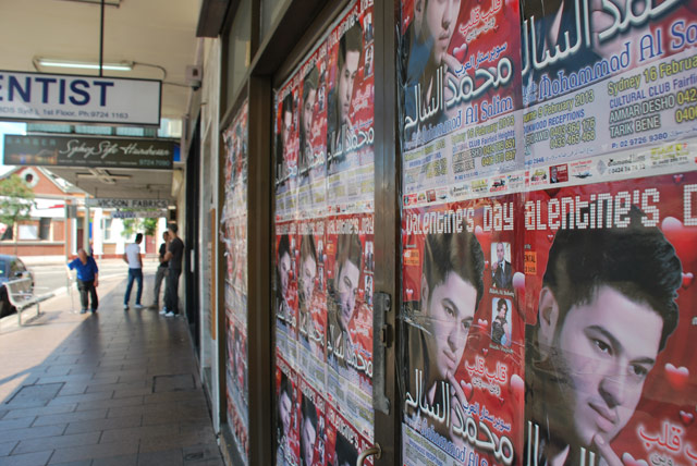 A poster for a Valentine’s Day event, targeting the local Middle Eastern community. Many communities advertise their cultural events in the locality and host artists from overseas. In the background is a fabric shop – one of many in Fairfield and Cabramatta, which are popular among many people of migrant background from within and outside the Fairfield area.