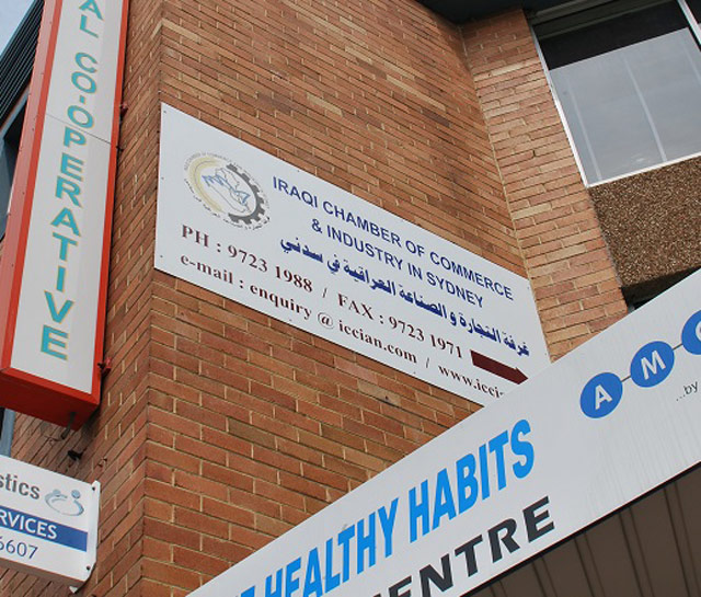 Iraqi Chamber of Commerce sign reflects the large Iraqi community in the Fairfield area. Between 2006 and 2011 there was a significant increase in the number of residents in Fairfield City who were born in Iraq.