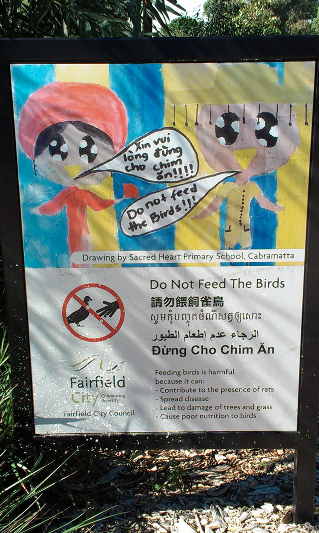 A multi-lingual park sign in Cabramatta, advising local residents not to feed the birds. This activity was popular with some migrant residents who considered it an act of generosity. The local council deemed leaving food for birds a health hazard as it also attracted rats to the area, and children at the local school were asked to design a sign that communicated this message. The sign reflects the sizeable presence of Asian communities that have settled in Cabramatta and surrounding suburbs. At the 2011 Census Vietnamese was the main language (other than English) spoken at home by residents of the broader Fairfield area, as well as residents of Cabramatta specifically.