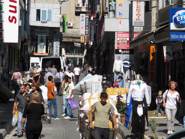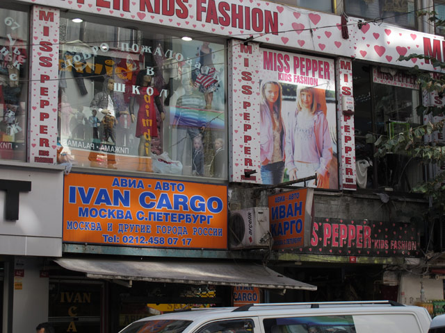 Streets connecting Kumkapi to Laleli is full of textile and cargo shops. These shops aim to attract entrepreneurs from the post-Soviet countries. Therefore, the majority of the sign texts are in Russian. Shops also employ migrants (usually women) as translators from/to Russian to Turkish.