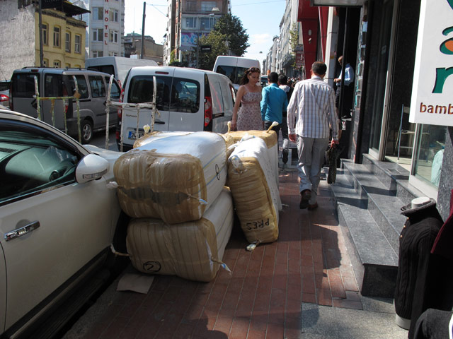 The 1990s experienced the collapse of communism in the Northern neighbours of Turkey. The majority of the post-Soviet countries soon suffered from high levels of unemployment due to the ‘shock therapy’ economic reforms that they were subject to. Turkey’s relatively liberal visa regime then allowed their citizens to migrate and look for jobs in Turkey. As such, the 1990s witnessed the arrival of foreigners from the post-Soviet countries to work in the growing textile, automotive, domestic work and entertainment sectors in Turkey. The picture captures female migrants from these countries and a local young man carrying textile goods.